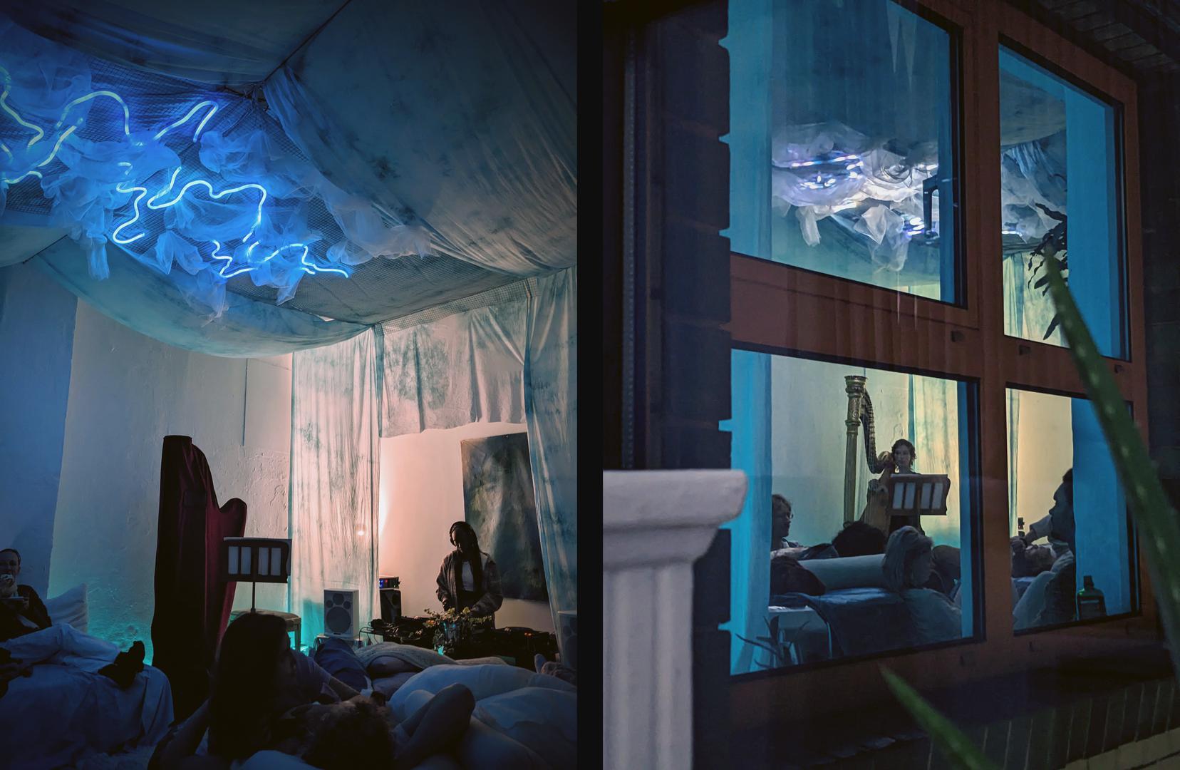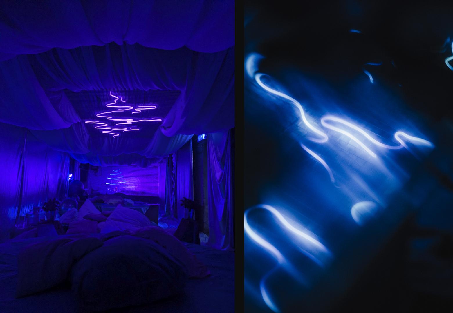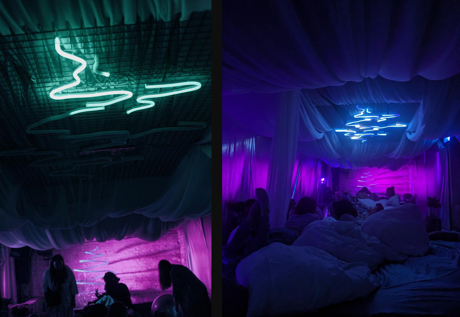 overflow's form and softly evolving light patterns are guided by the play of light catching on ripples of water, and it provides a warm bath of colour to relax beneath. It formed the ceiling centrepiece of the Overflow Studio, and the piece sparkled above sensory rave spas, somatic dances, yoga sessions, immersive dinners and parties.